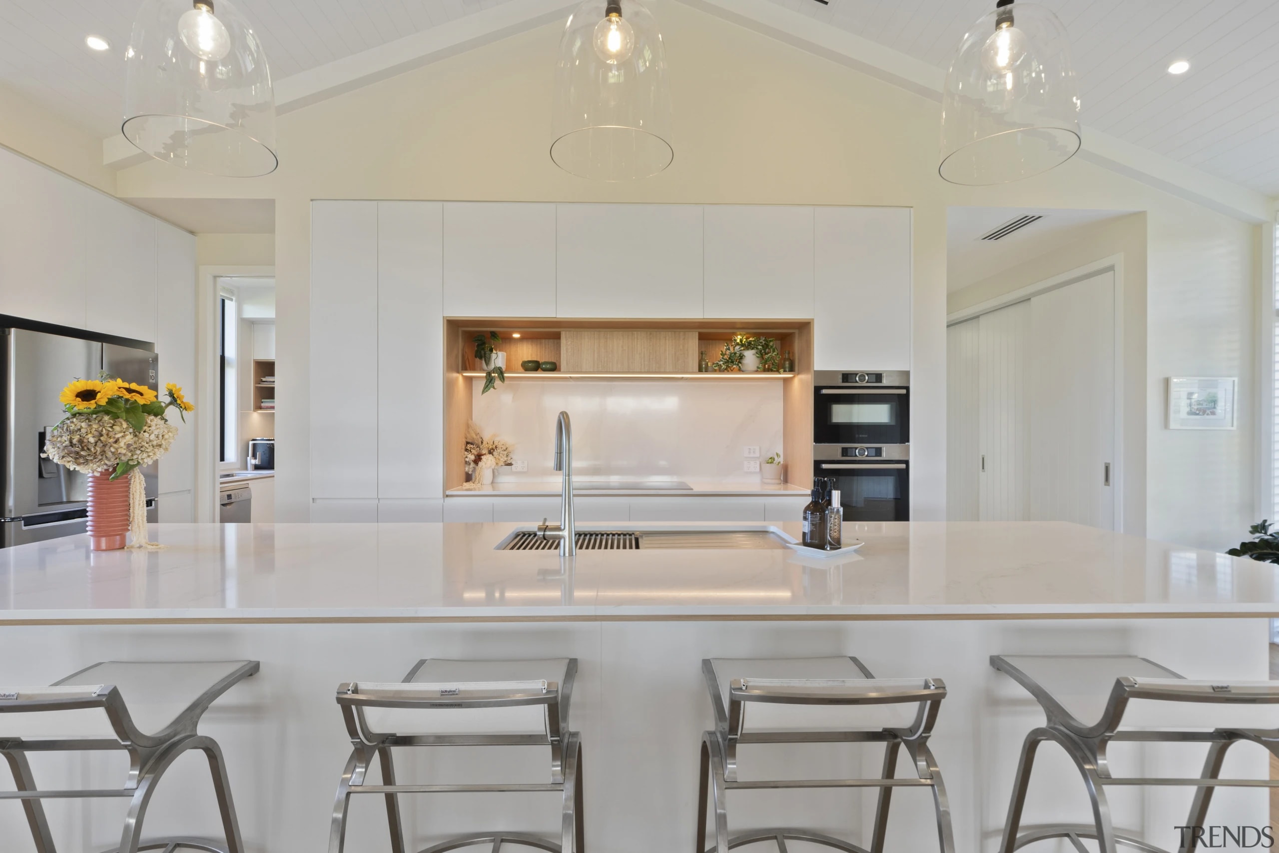 The sleek, white kitchen, complete with a scullery and a long island that doubles as a breakfast bar, is ideal for both daily living and entertaining.