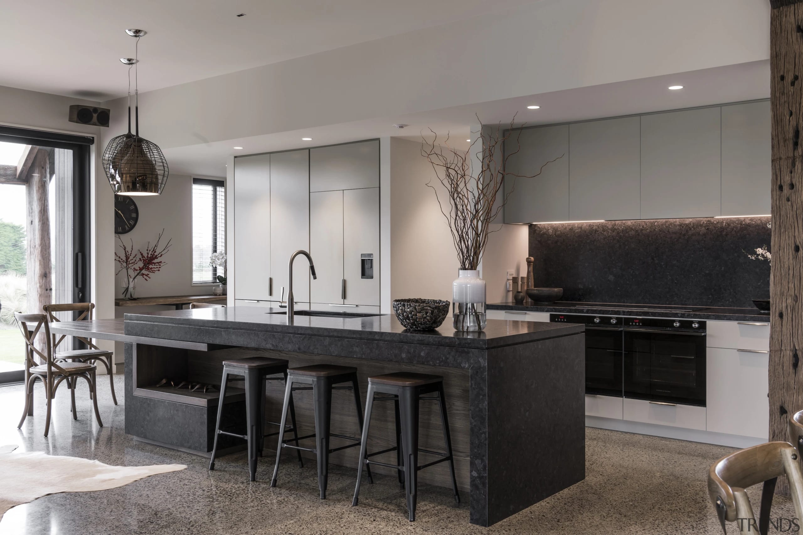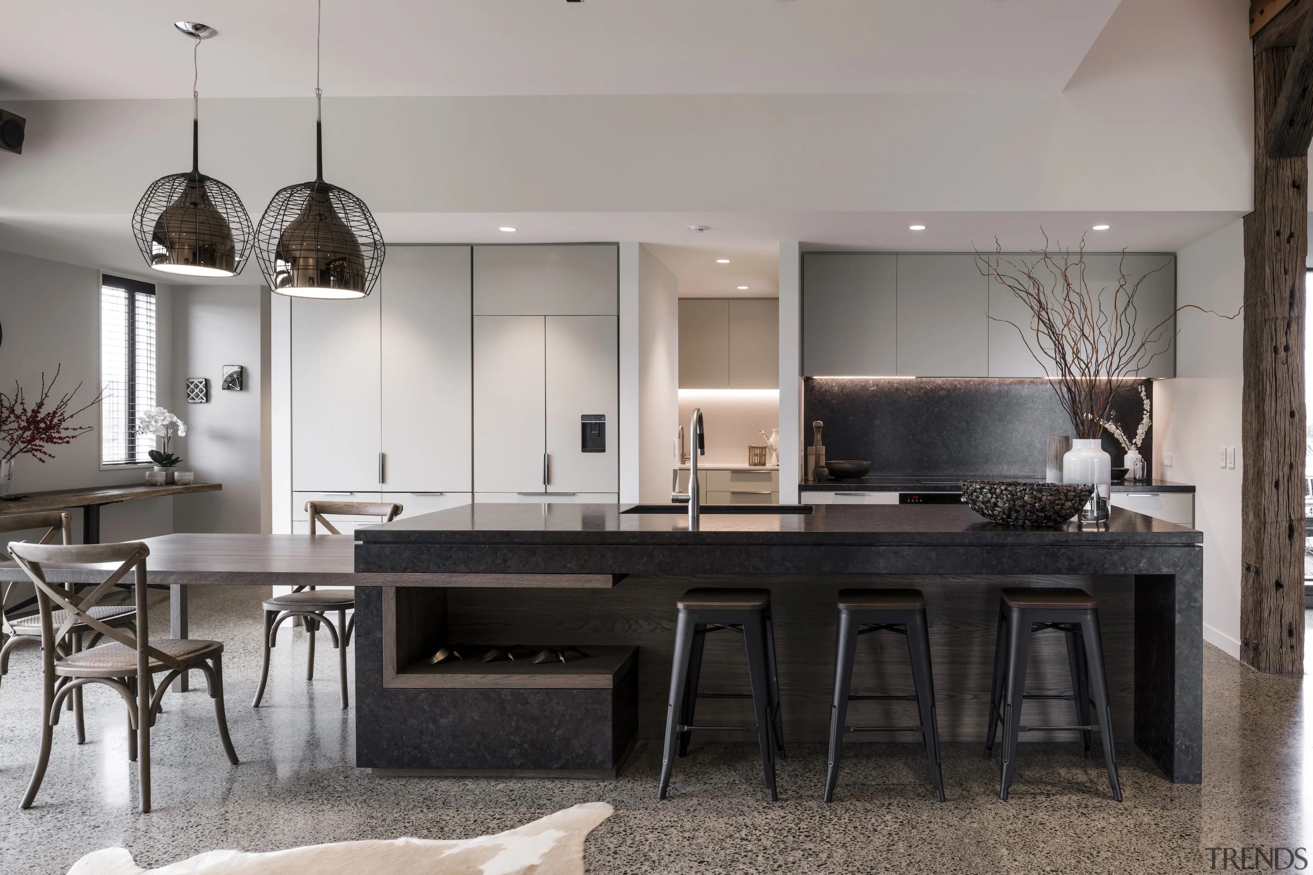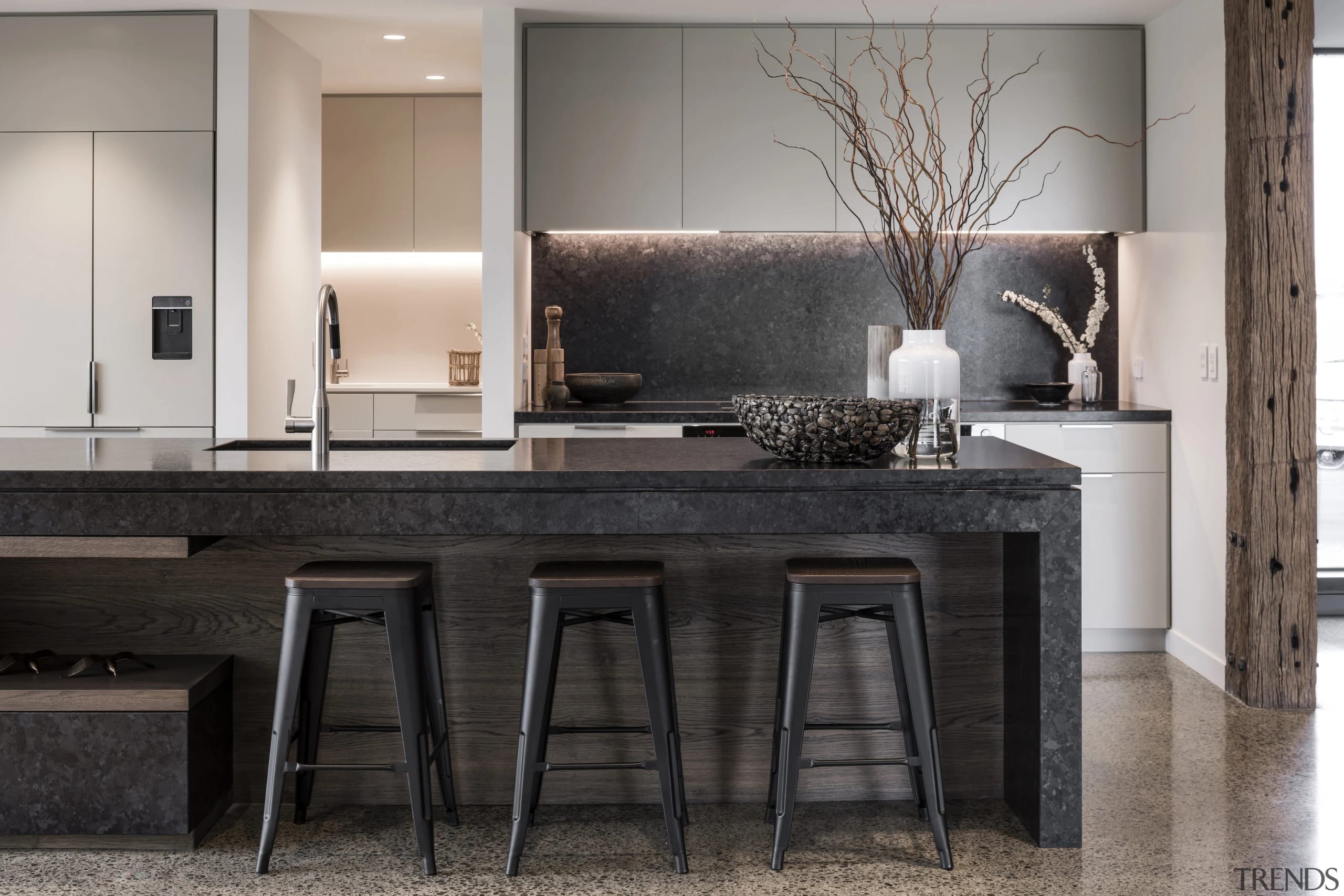 The combination of finishes, layered forms, mitred details, the tone and texture in the striking concrete floor, and the choice of fully integrated appliances results in a design that looks resolved, uncluttered and sharp.