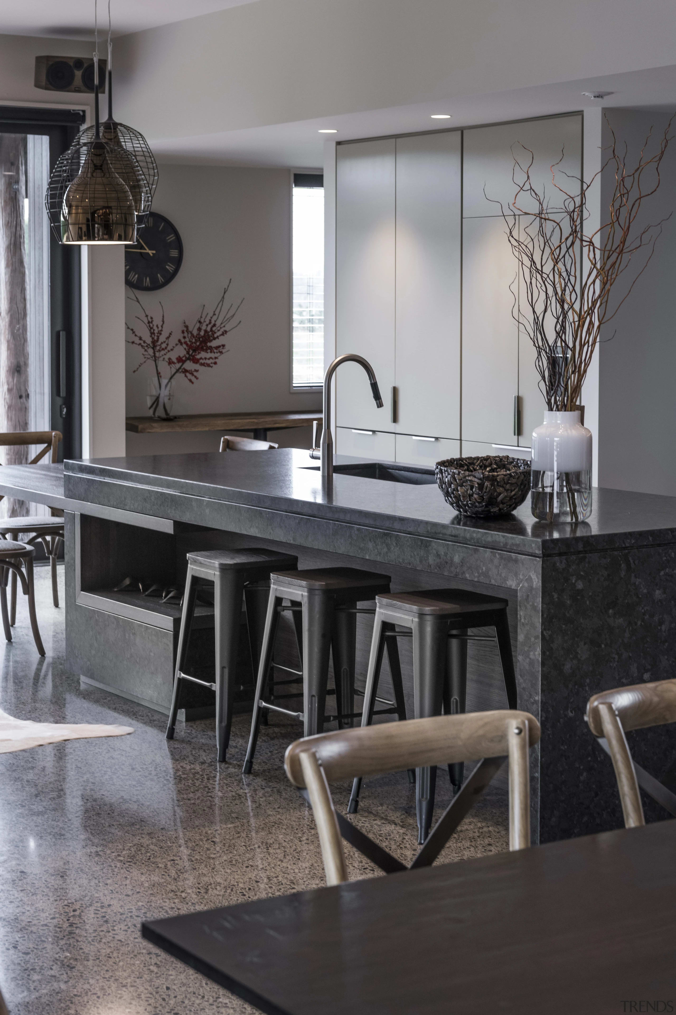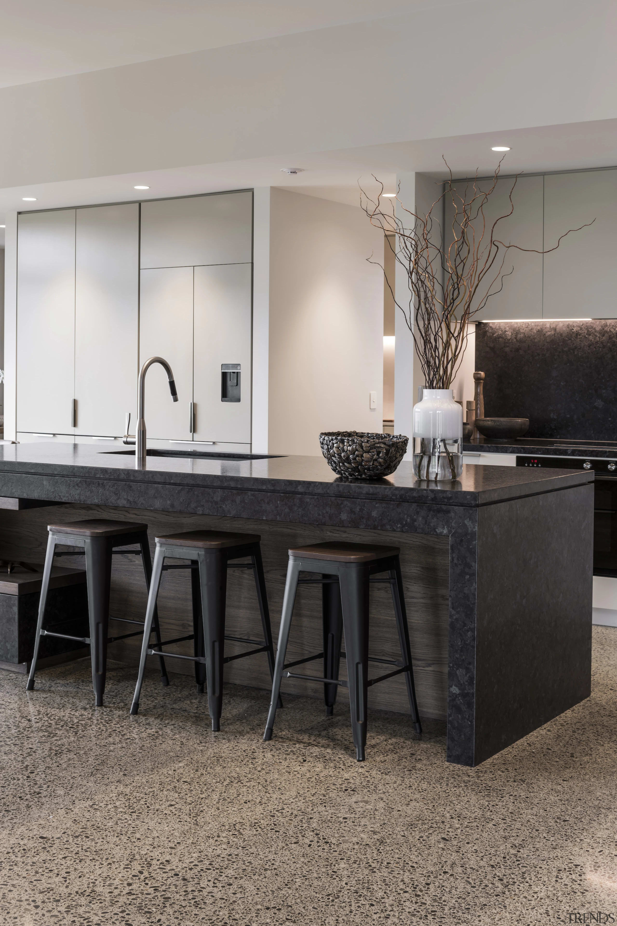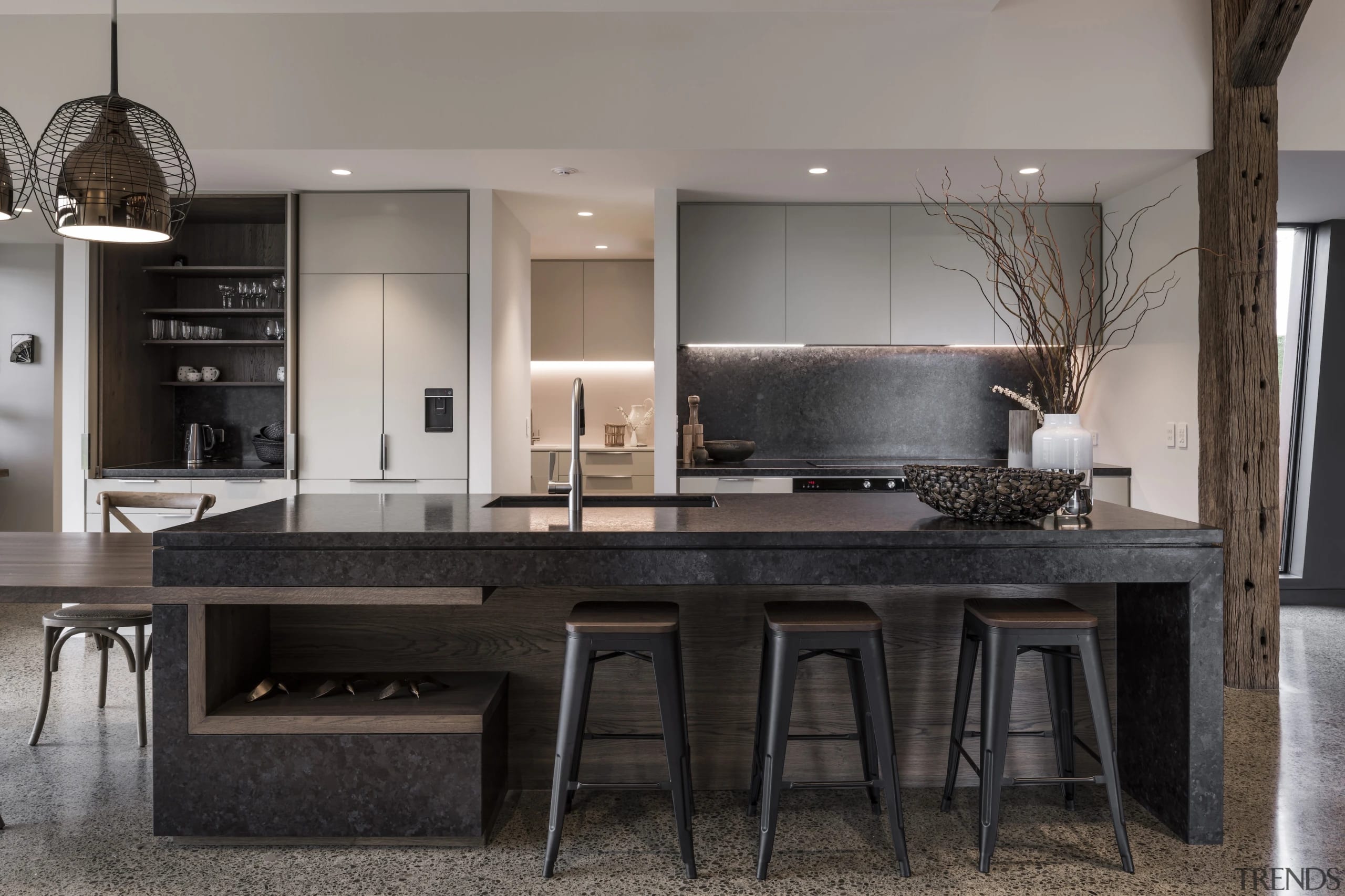 The combination of finishes, layered forms, mitred details, the tone and texture in the striking concrete floor, and the choice of fully integrated appliances results in a design that looks resolved, uncluttered and sharp.