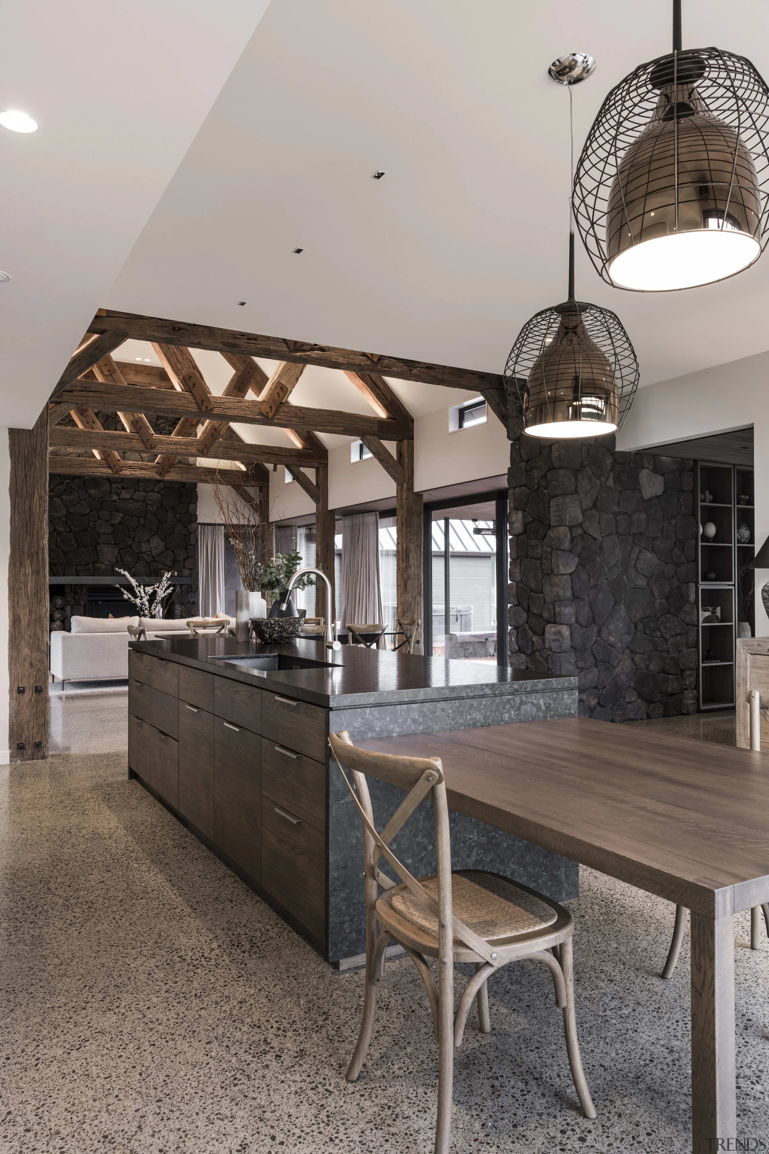 The kitchen is situated at the end of a large living and dining space reinforced with visually dominant recycled bridge beams.