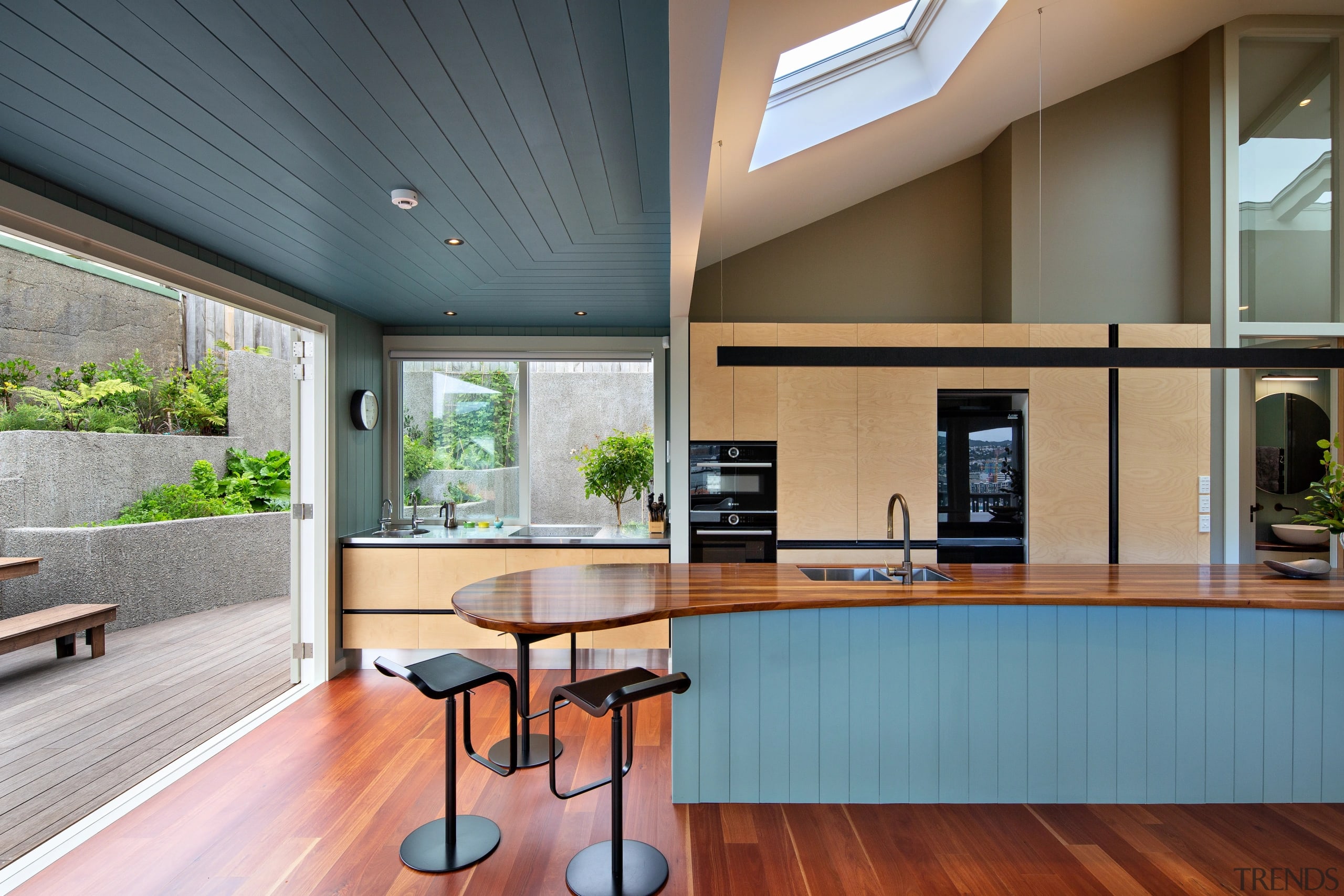 The island has curved hangout spaces at each end, one for seating and one for standing, while the T&G facing links the island with the ceiling and walls—vintage materiality revisited with contemporary colours and form.