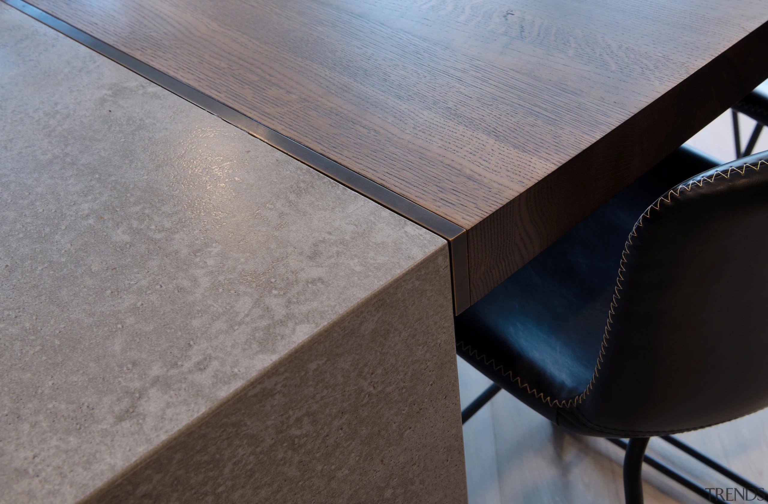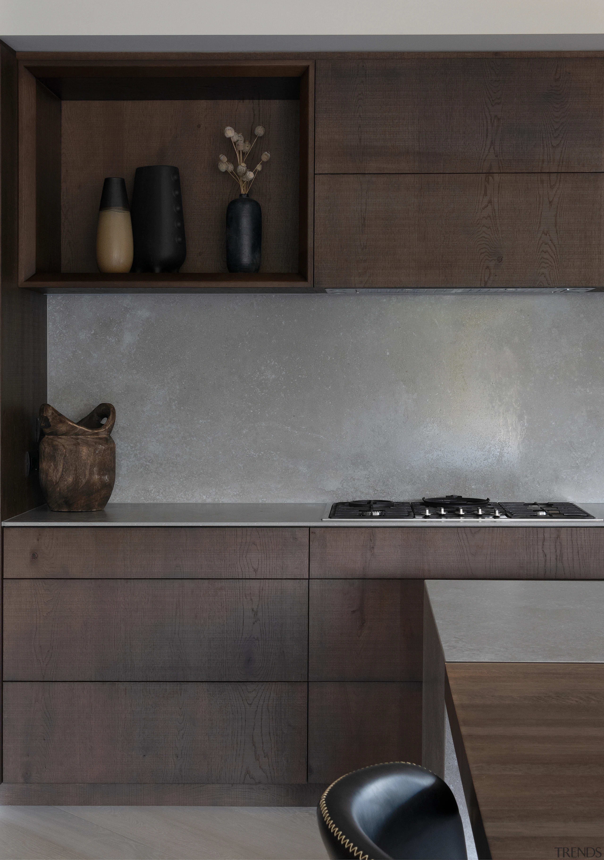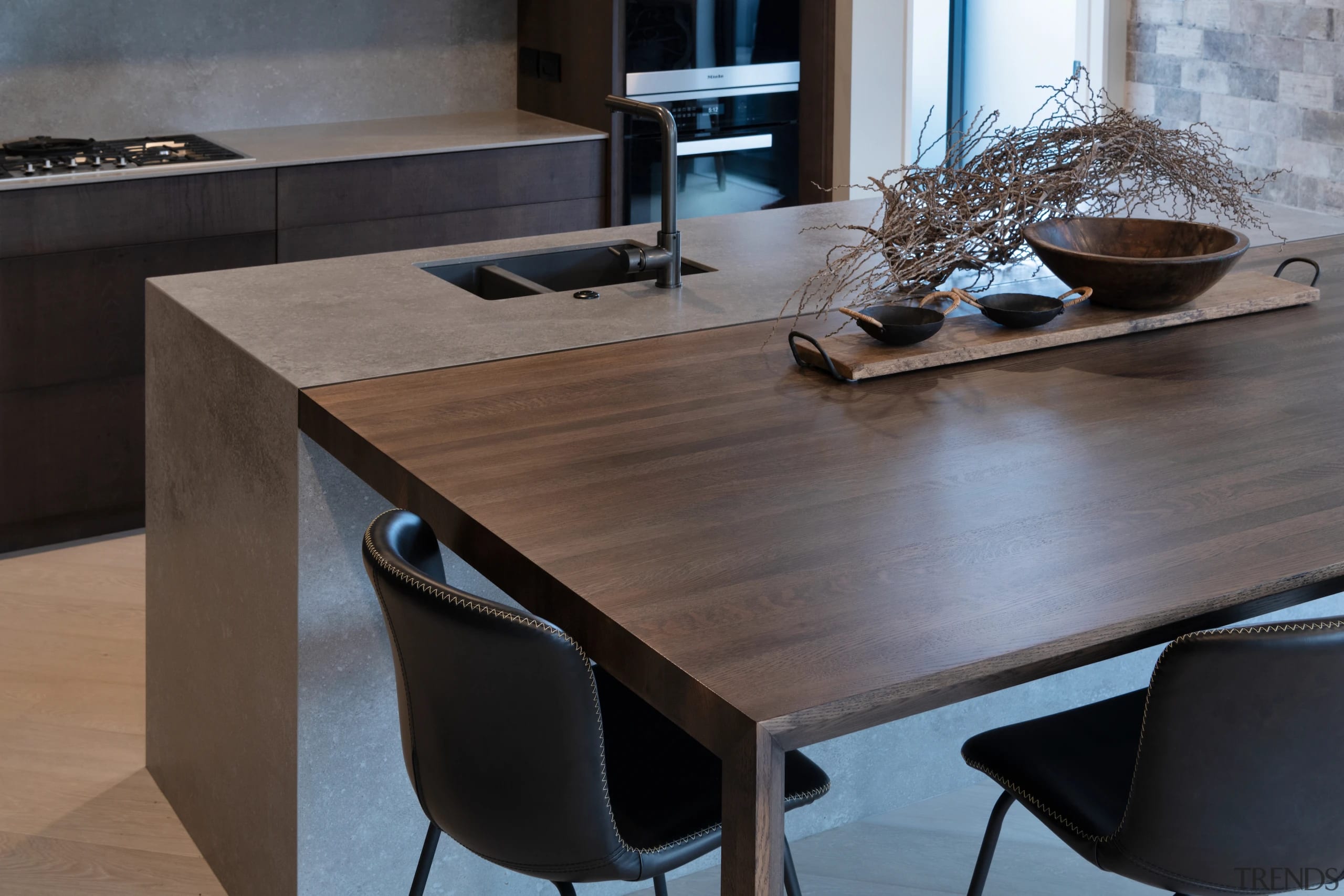 The juxtaposition of a warm, dark colour palette of deep-toned, rustic sawn timber cabinetry and the cool, smooth rectilinear concrete shapes of the benches and island begins a conversation between the urban and the rustic.