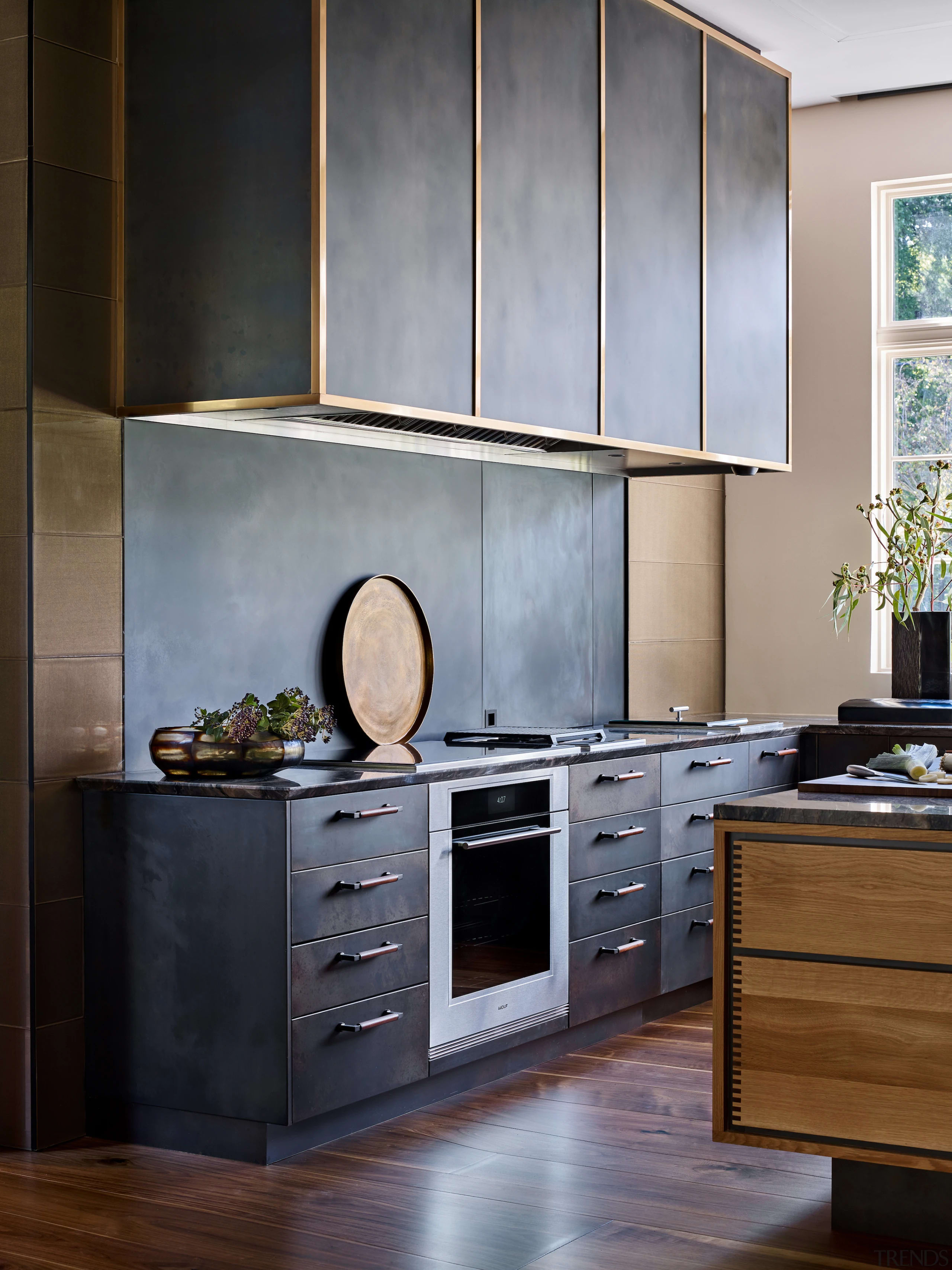 The cabinetry features a surprising mix of materials, including metal, oak, and birdseye maple, all topped with Fusion Blue quartzite and Cyprum metallic plumbing by Dornbracht.
