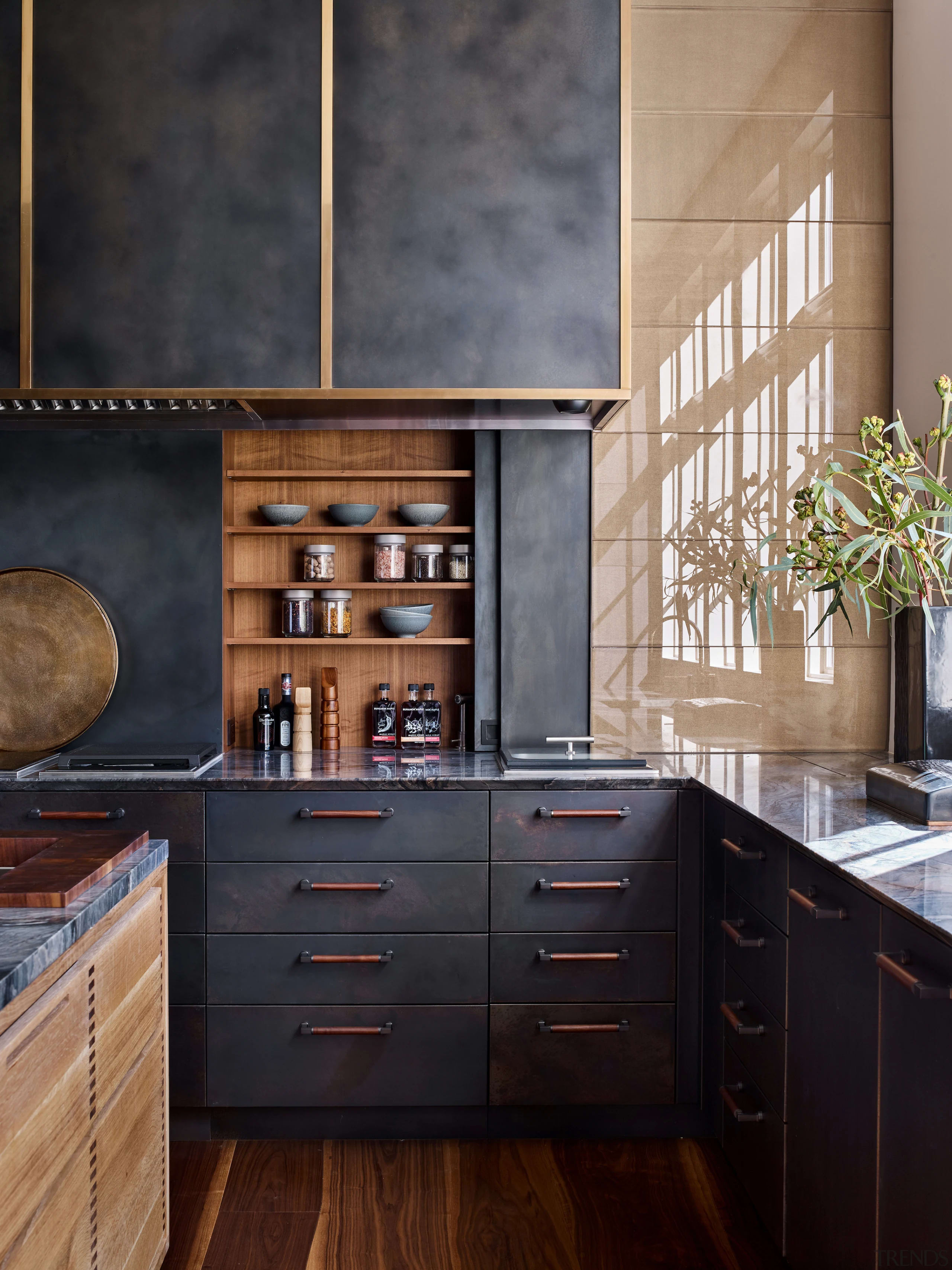 The counter-to-ceiling splashback was designed utilising gold wallpaper topped with mesh fabric that the designer had laminated in glass, creating a glimmering statement piece.