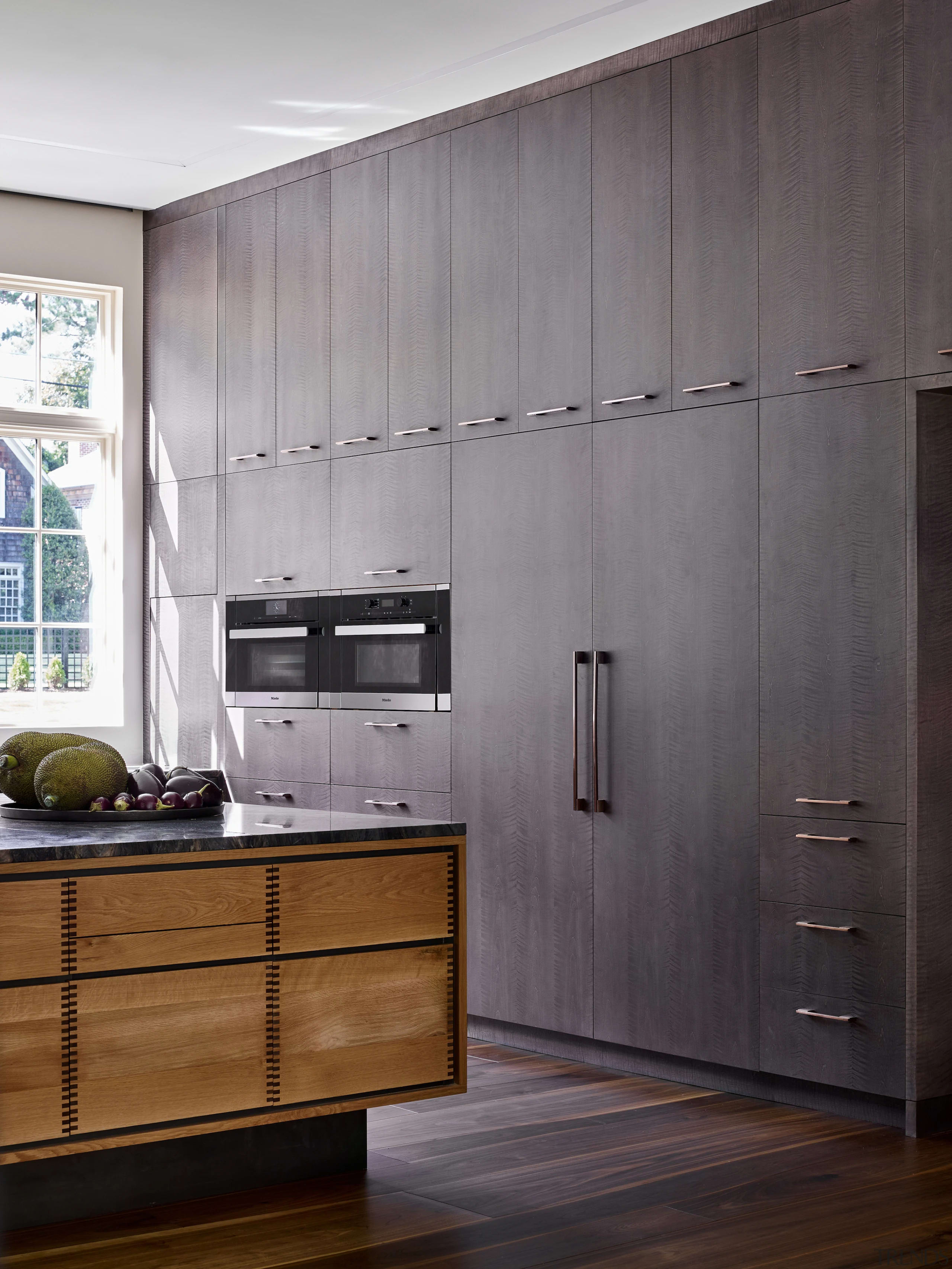 An expansive sycamore wood wall hides the Sub-Zero refrigerator/freezer and a juice bar and houses a Miele plumbed combi-steam oven, microwave, and warming drawer.